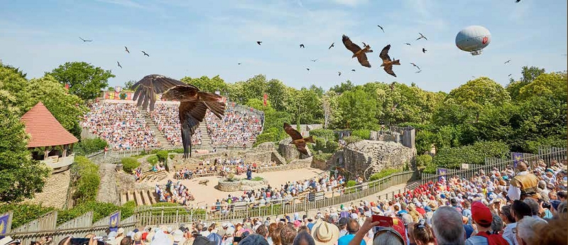 Visite libre du Parc : Spectacles : Les Vikings- Le Mousquetaire de Richelieu- Le Bal des Oiseaux Fantômes- Le Secret de la Lance- Le Signe du Triomphe- Le Dernier Panache Déjeuner sur le Parc avec vos coupons de restauration, valables dans tous les points de restauration rapide du Parc. Continuation de la visite libre du Parc.
